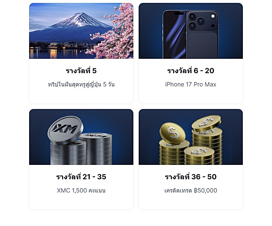 » ในการเข้าร่วมกิจกรรมแจกรางวัลประเภทนี้ โปรดลงทะเบียนเข้าร่วมโปรโมรชั่น Gala ด้วยบัญชีเทรดจริง  XM  ของคุณ โดยมียอดเงินในบัญชีขั้นต่ำที่ $300 หรือเทียบเท่าสกุลเงินอื่น จากนั้น เพียงเทรดตราสารที่ร่วมรายการให้ครบ 5 standard lot หรือ 600 micro lot  ภายในวันที่ 30 กันยายน – 24 ตุาคม 2568